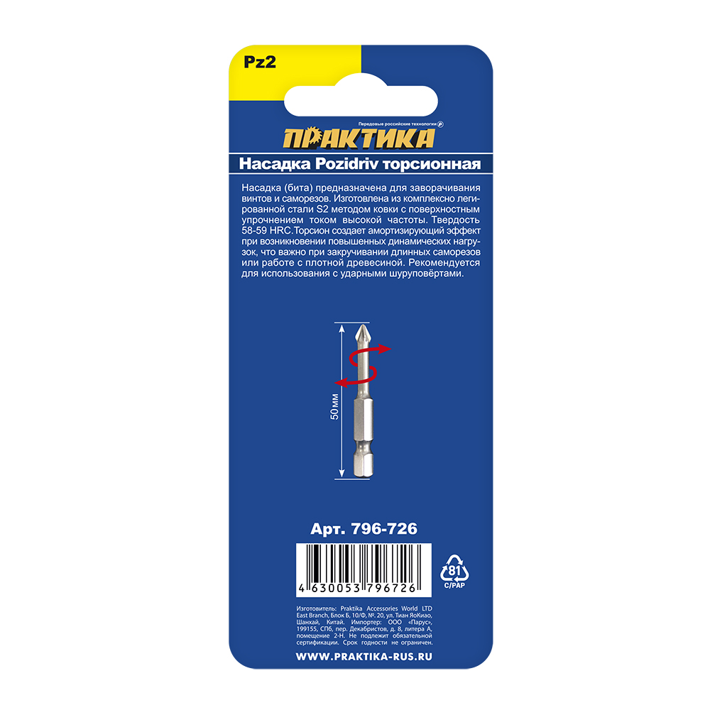 Бита отверточная ПРАКТИКА Профи PZ-2 х 50мм 796-726