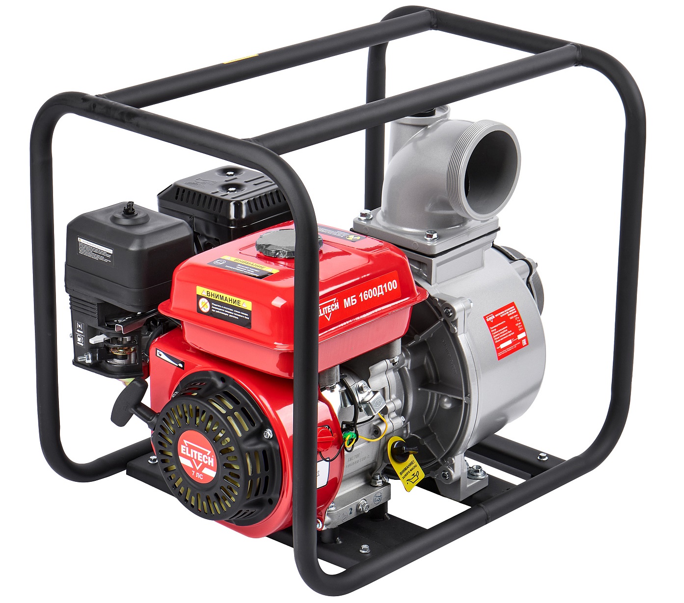 Мотопомпа ELITECH МБ 1600 Д 100 с 4-х тактным бензиновым двигателем и ручным стартером производительностью 1600 л/мин. применяется для перекачивания чистой и слабозагрязненной воды с диаметром частиц до 7 мм.
