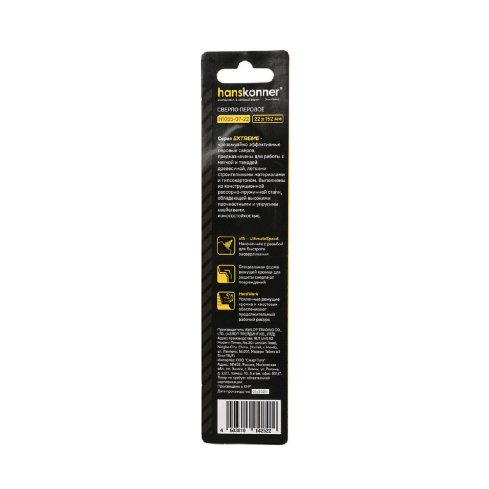 Сверло перовое по дереву Hanskonner H1055-07-22