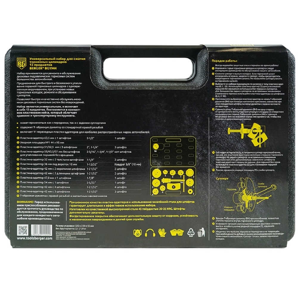 Набор для сжатия тормозных цилиндров Berger, в кейсе 13 предметов BG BG1944 применяется для ремонта и обслуживания дисковых гидравлических тормозных систем большинства автомобилей.